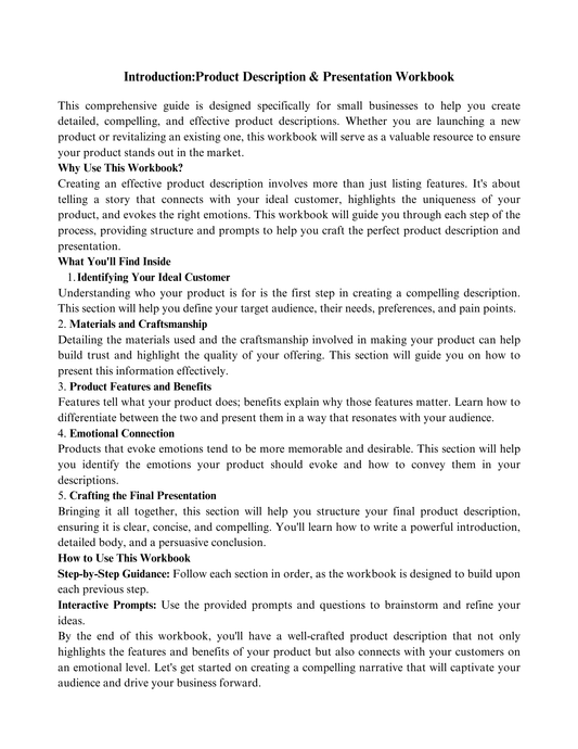 PRODUCT DESCRIPTION & PRESENTATION WORKBOOK