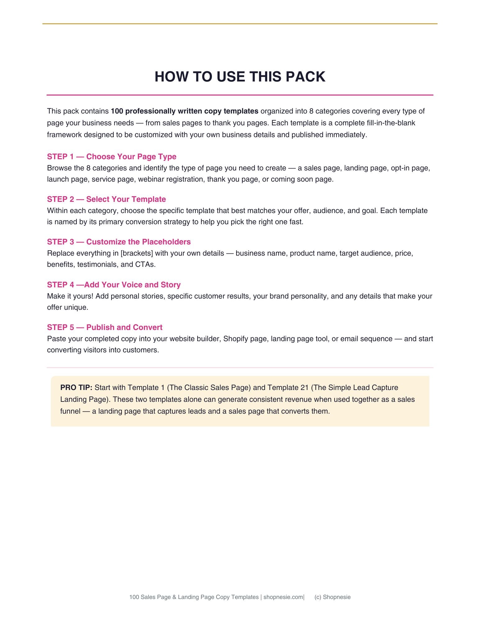 Each template includes a complete headline, subheadline, body copy sections, call to action, and a pro copywriting tip ā so you have everything you need to build a professional, high-converting page without hiring a copywriter.