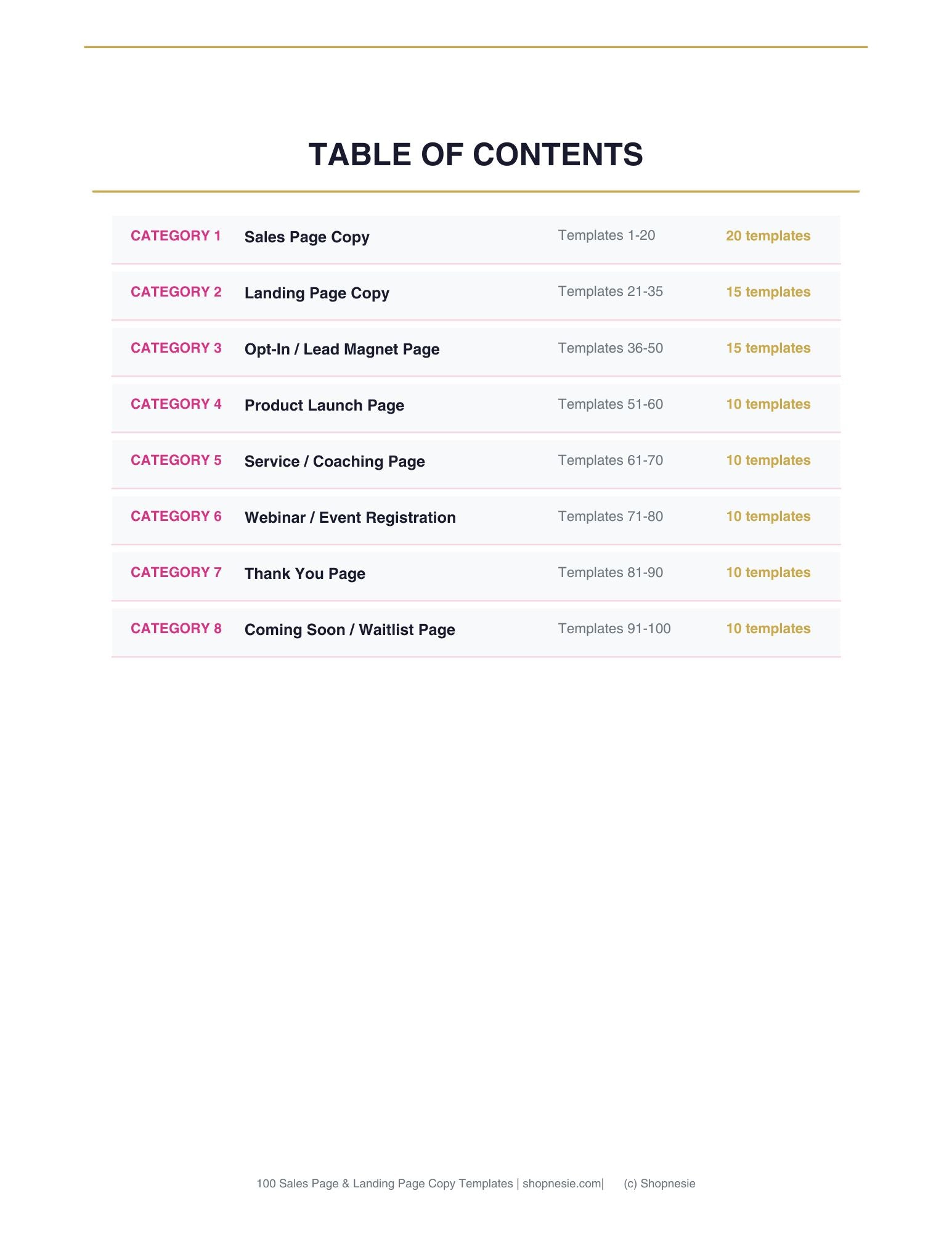 Category 1 ā Sales Page Copy (20 Templates) The most comprehensive section in the pack. Whether you need a classic sales page, a story-led page, a results-focused page, a comparison page, a transformation page, or a no-brainer offer page ā you'll find a proven framework ready to customize. Covers urgent offers, bundle pages, testimonial-heavy pages, FAQ-driven pages, authority pages, and more.
