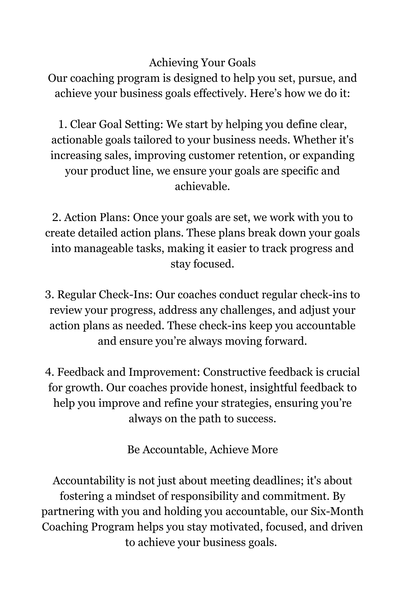 Embark on a transformative journey with our Six-Month marketing and accountability Coaching Program and equip yourself with the knowledge, tools, and confidence to take your small business to new heights.