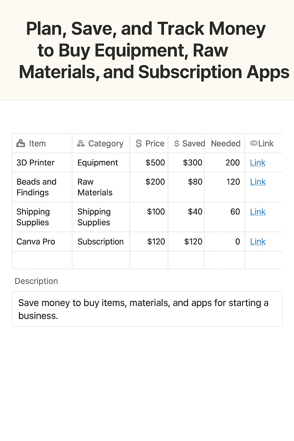 Starting a business takes strategy—and smart saving. This Notion template is your all-in-one tool to plan, save, and track your financial goals as you prepare to buy the essential equipment, raw materials, and subscription tools you’ll need.