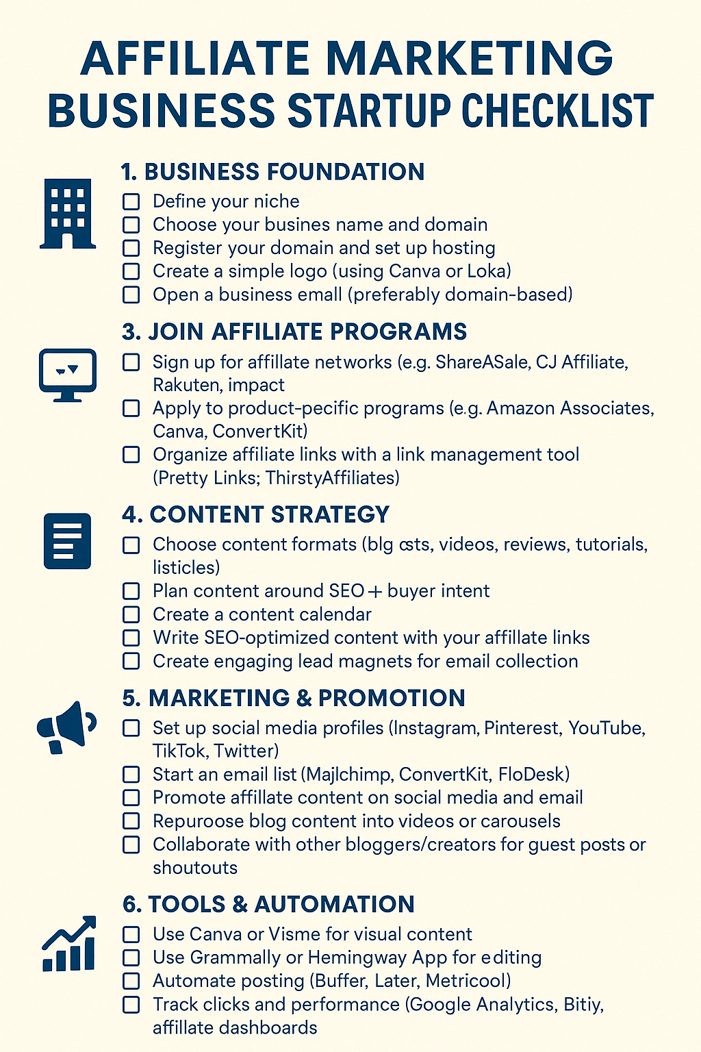 Ready to launch a profitable affiliate marketing business but not sure where to begin? This step-by-step startup checklist is your ultimate guide to building a strong foundation and growing your affiliate income with confidence.