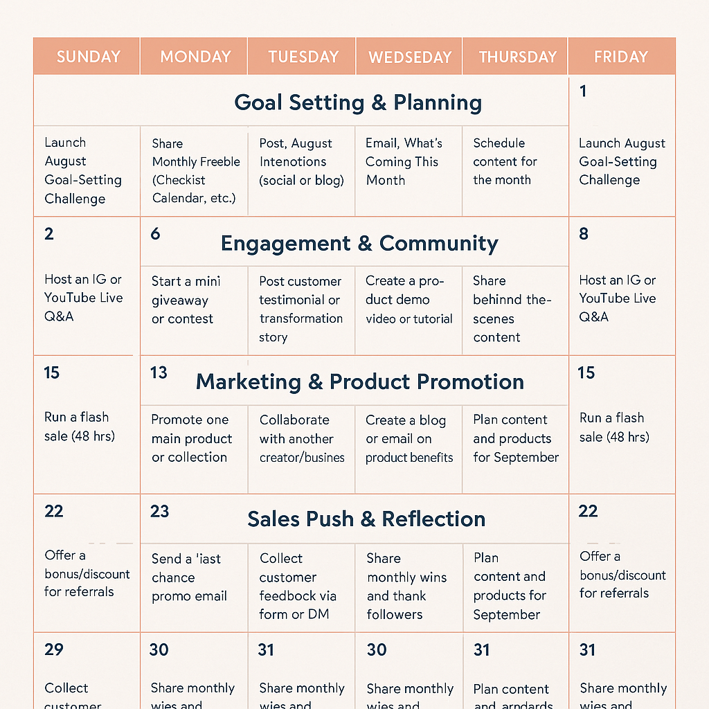 This calendar isn’t just a list of dates—it’s a strategic 31-day roadmap filled with purpose-driven marketing activities, weekly business themes, and proven promotional tactics designed to increase visibility, grow your audience, and generate more sales.