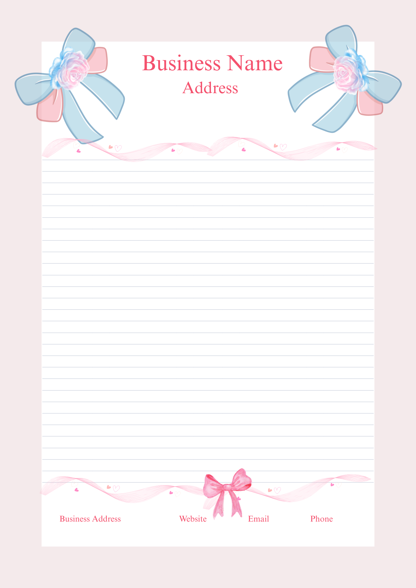 Present your brand beautifully with this Editable Business Letterhead Template, designed with delicate bows, soft pastel tones, and a clean-lined layout. This letterhead is ideal for small business owners, creatives, and boutique brands who want their correspondence to feel polished, feminine, and on-brand.