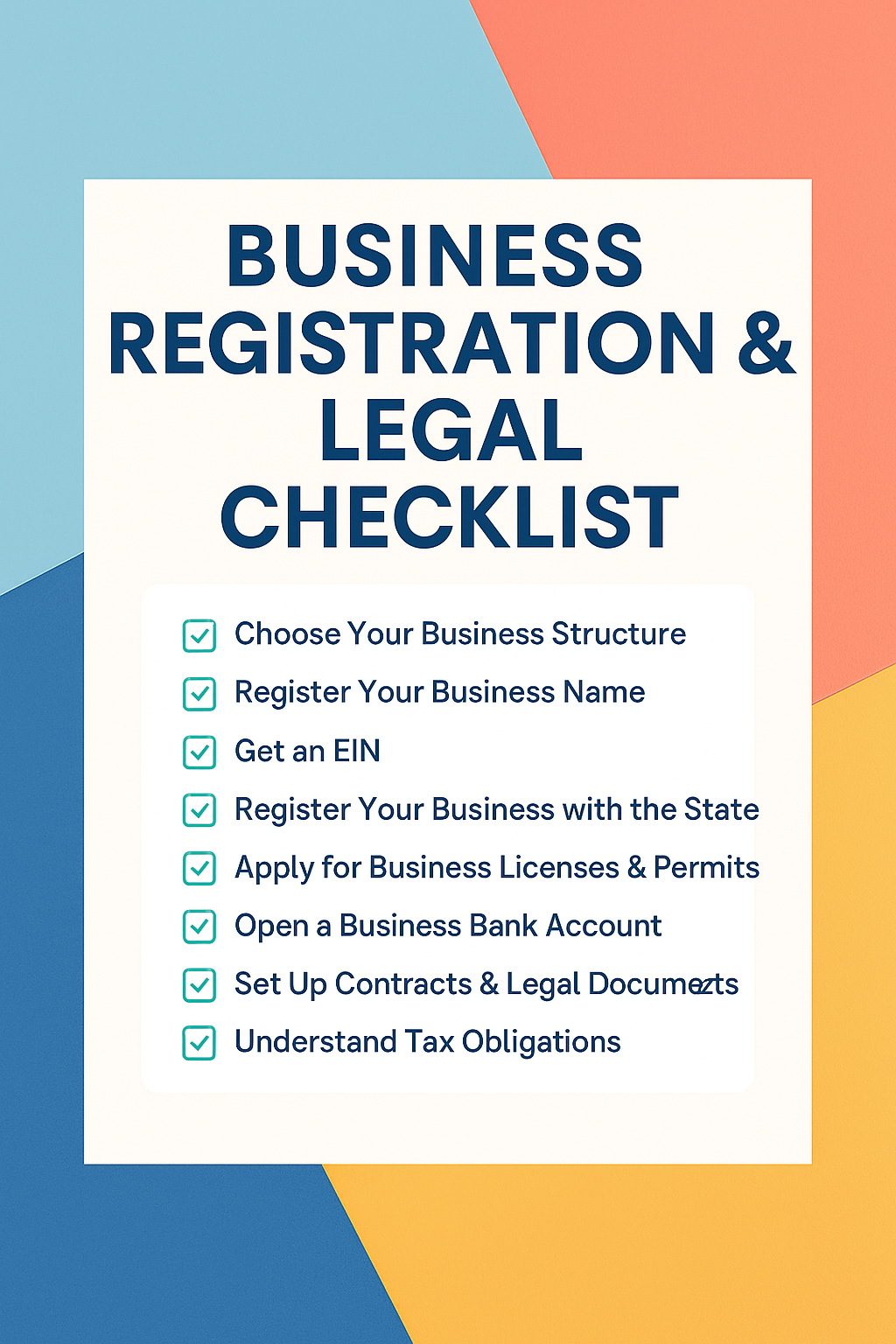 The Business Registration & Legal Checklist walks you through everything you need to get your business legally up and running—from choosing the right structure to applying for licenses, EINs, and more.