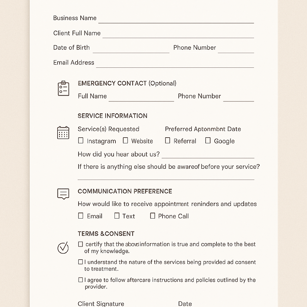 Streamline your onboarding process with this professional Client Intake Form Template—perfect for service providers, beauty and wellness professionals, consultants, and creatives. This editable form is designed to gather essential client information including contact details, service preferences, health disclosures, emergency contact info, and consent agreements.