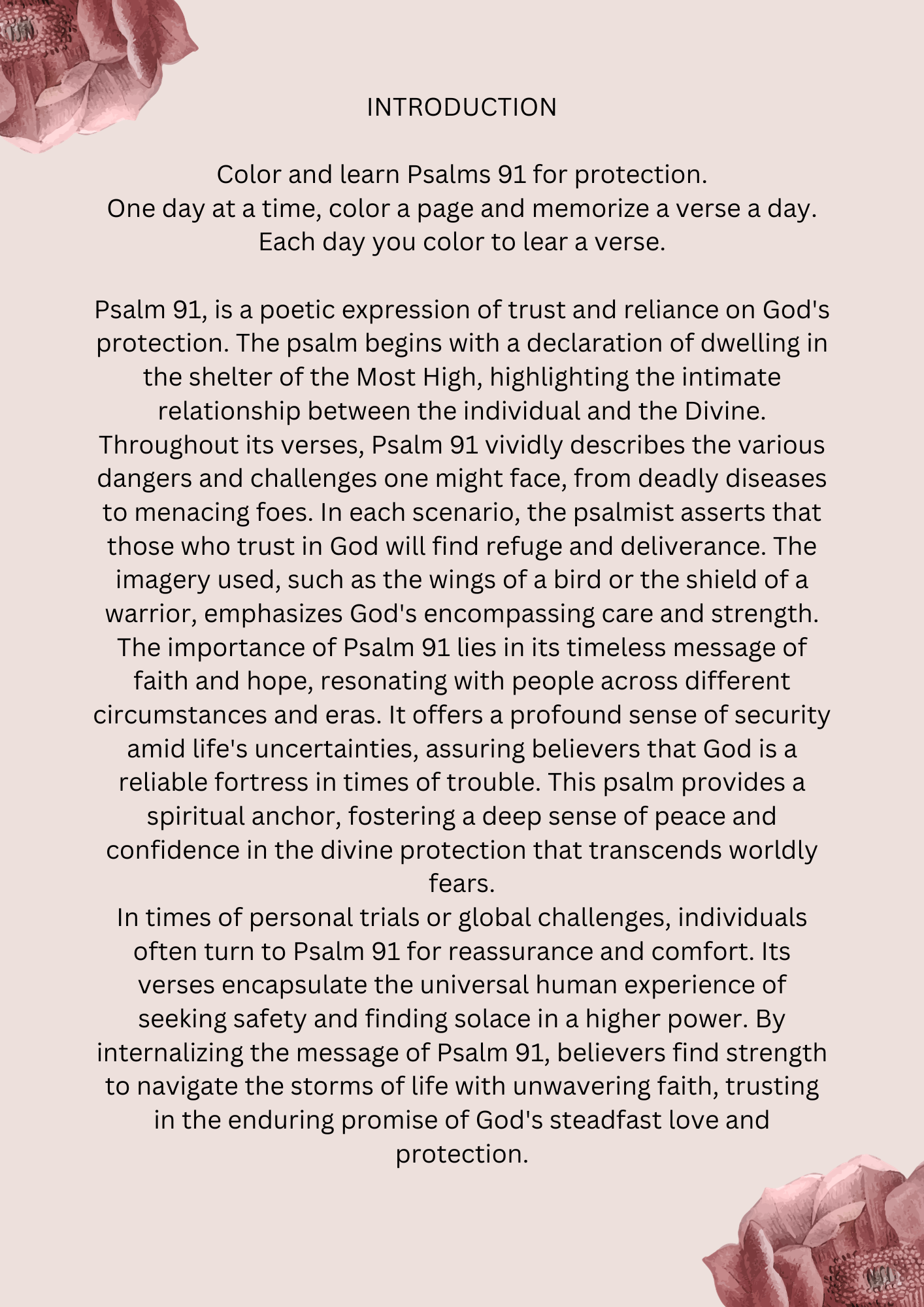 "Color and Learn Psalms 91 for Protection" is more than just a coloring book—it's a journey of faith and creativity that invites you to explore the depth of Psalm 91 in a new and engaging way. Whether you're seeking a daily spiritual practice, a creative outlet, or a meaningful gift, this coloring book offers a unique and enriching experience. Embrace the power of Psalm 91, one page at a time, and let the calming process of coloring bring you closer to the divine promises of protection and peace.