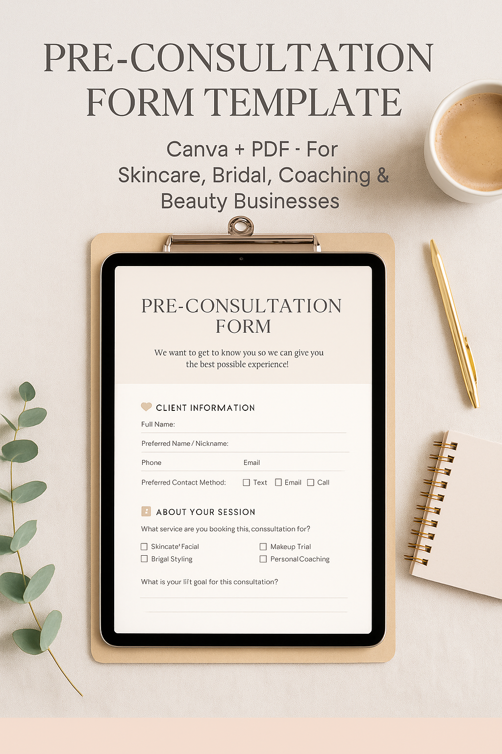 Whether it’s for a skincare review, a bridal accessory plan, or a confidence-boosting coaching session, this template helps you understand your client's goals, preferences, and challenges — beautifully and professionally.