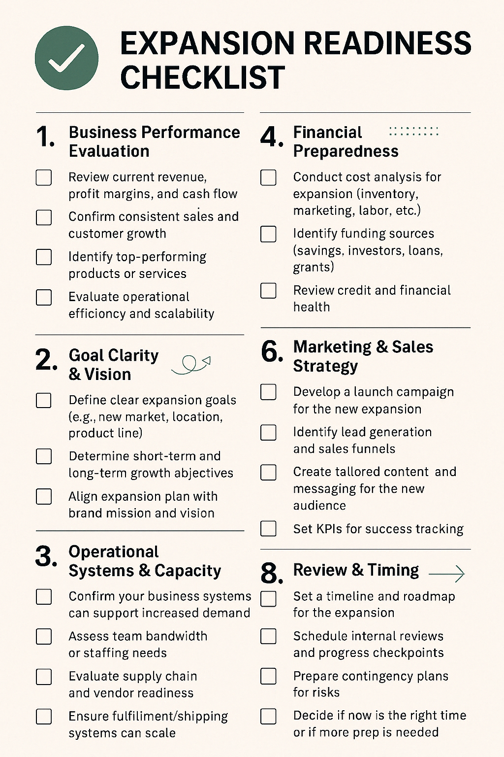 Thinking about growing your business? The Expansion Readiness Checklist is your essential tool to assess, prepare, and plan for scaling successfully. Whether you're launching a new product line, entering a new market, or expanding locations, this checklist walks you through key areas like finances, operations, staffing, marketing, and timing. Perfect for small businesses, product brands, and digital entrepreneurs looking to grow with confidence and clarity.