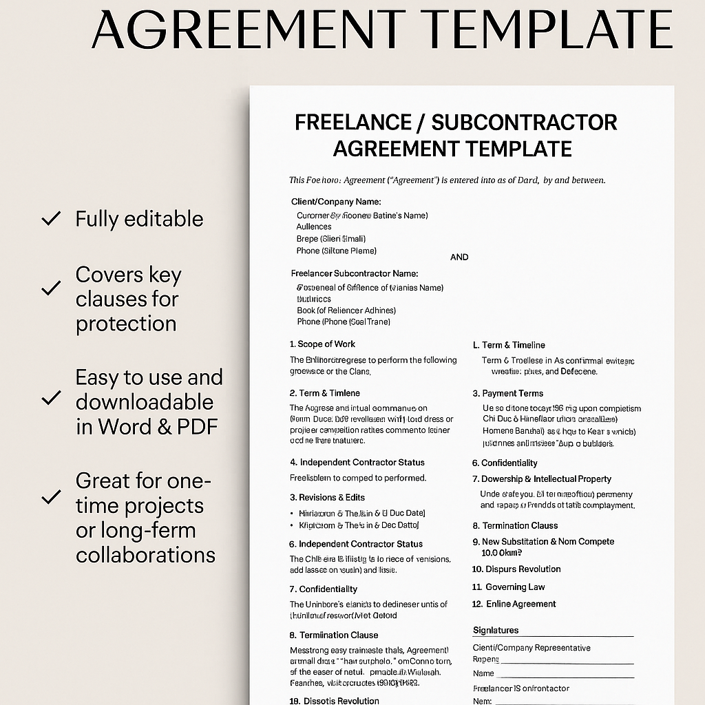 Set clear expectations and protect your business with this ready-to-use Freelance / Subcontractor Agreement Template. Whether you're hiring a freelancer or offering your services as one, this professional contract outlines project scope, payment terms, intellectual property rights, confidentiality clauses, and more. Perfect for creatives, consultants, service providers, and agencies. Simply customize and send to your client to ensure a smooth and legally-sound working relationship.
