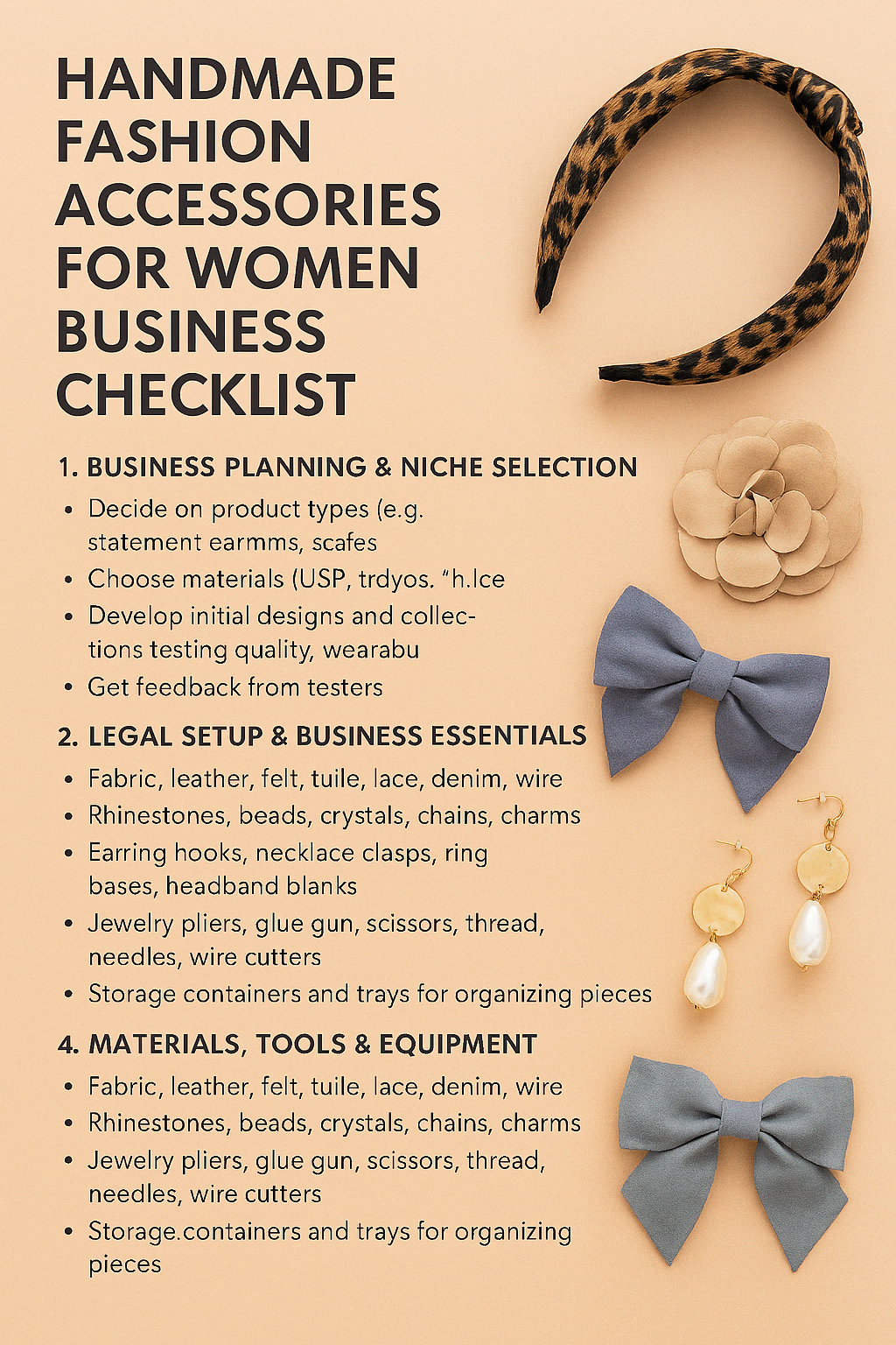 Turn your creativity into a thriving brand with this comprehensive Handmade Fashion Accessories Business Checklist for women. From statement earrings and stylish headbands to bridal brooches and chic scarves, this guide walks you through every essential step of building your accessory empire. Perfect for designers, crafters, and entrepreneurs, this checklist includes product planning, legal setup, pricing, branding, marketing, and scaling strategies—everything you need to launch and grow a fashion-forward business with confidence.