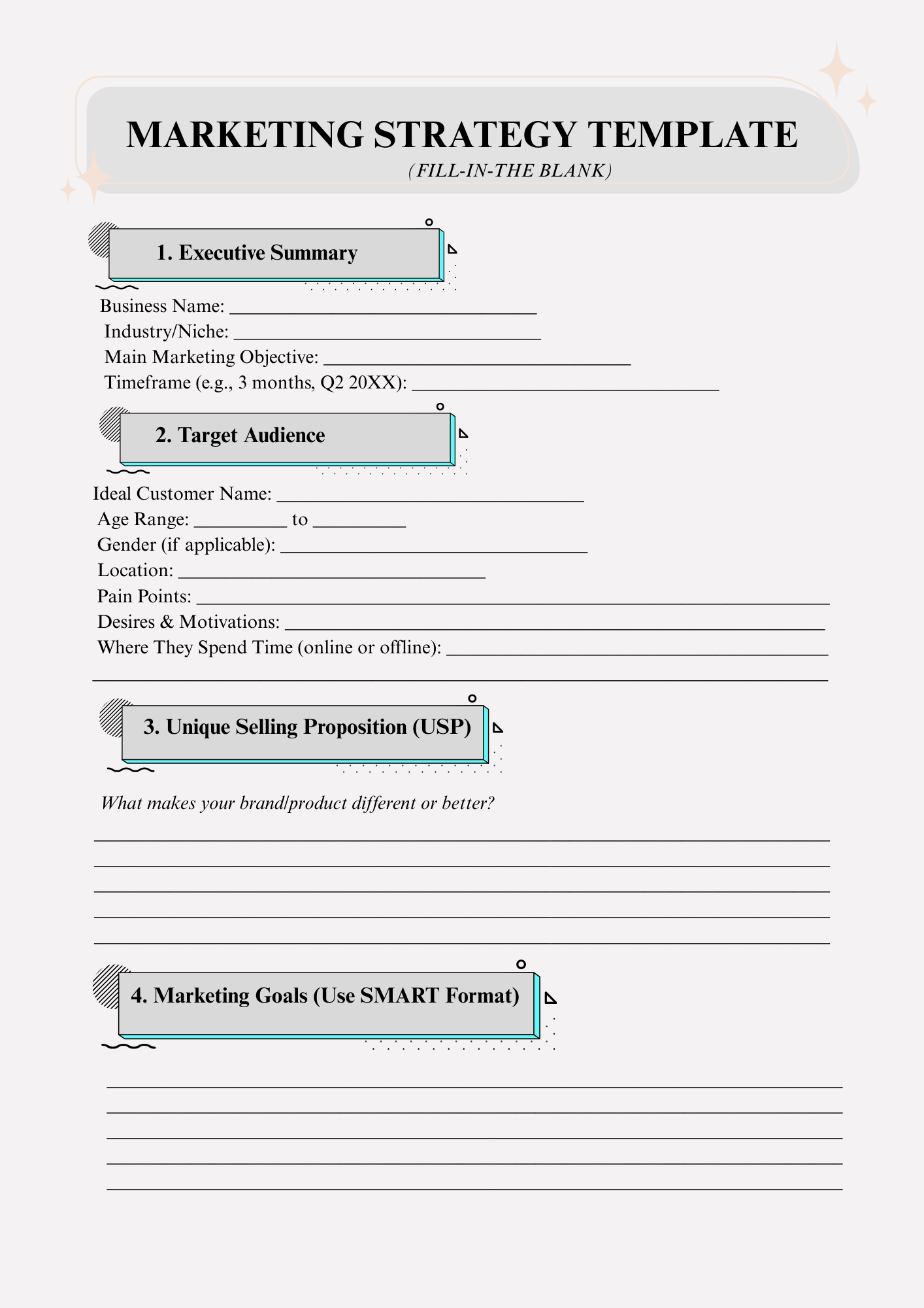 This template walks you step by step through building a strong marketing strategy, from defining your target audience and unique selling proposition to setting SMART goals, planning content, allocating your budget, and tracking performance. It’s fully editable in Canva, making it perfect for quick updates, collaboration, and ongoing strategy reviews.