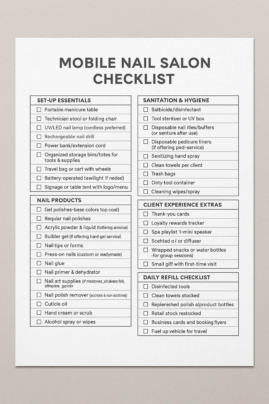 Starting or running a mobile nail salon? This all-in-one checklist is your go-to companion for staying organized, professional, and stress-free on the go!