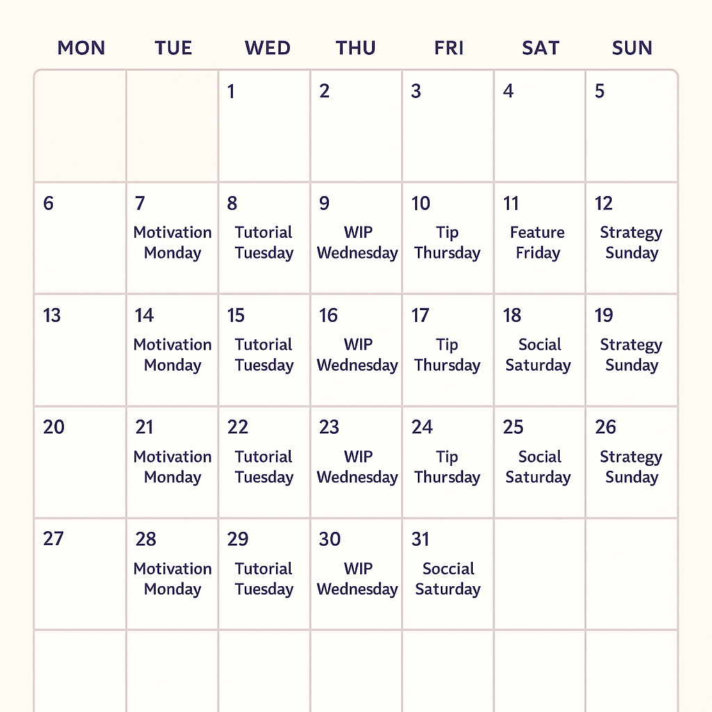 The September 2025 Social Media Calendar is a 30-day content plan designed for small business owners, creators, and entrepreneurs who want to stay consistent on platforms like Instagram, Facebook, TikTok, Pinterest, and YouTube. Each day is mapped with a unique content pillar, including Motivation Mondays, Tutorial Tuesdays, WIP Wednesdays, Tip Thursdays, Feature Fridays, Social Saturdays, and Strategy Sundays. This calendar provides daily post ideas, caption hooks, CTAs, asset prompts, and hashtags—helping you save time, beat content blocks, and grow your audience with purpose-driven posts.