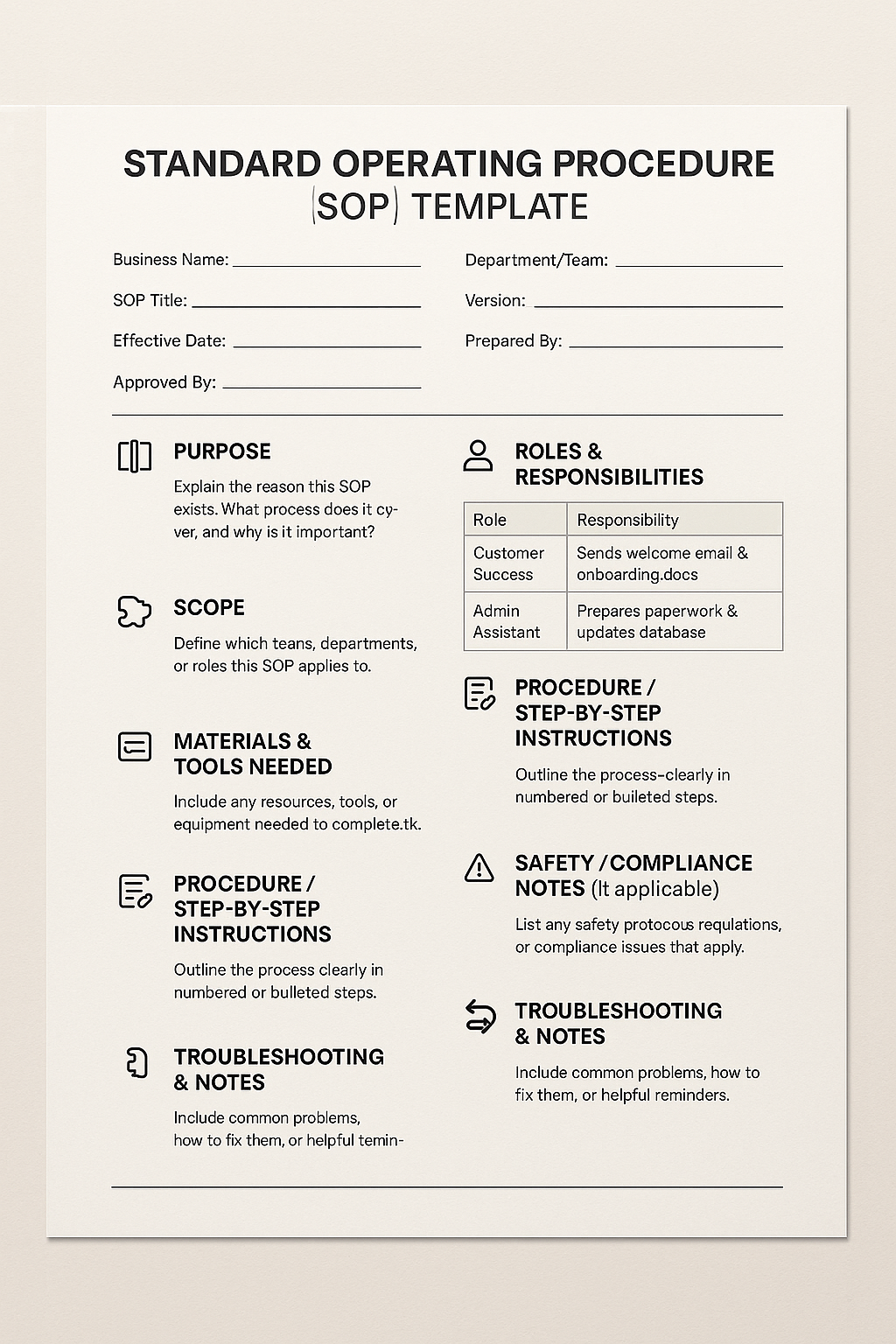 Boost your team’s efficiency and ensure consistency with this fully customizable Standard Operating Procedures (SOP) Template. Perfect for small business owners, team managers, service providers, and creatives, this easy-to-follow form helps document processes step by step—making training, scaling, and delegation a breeze.