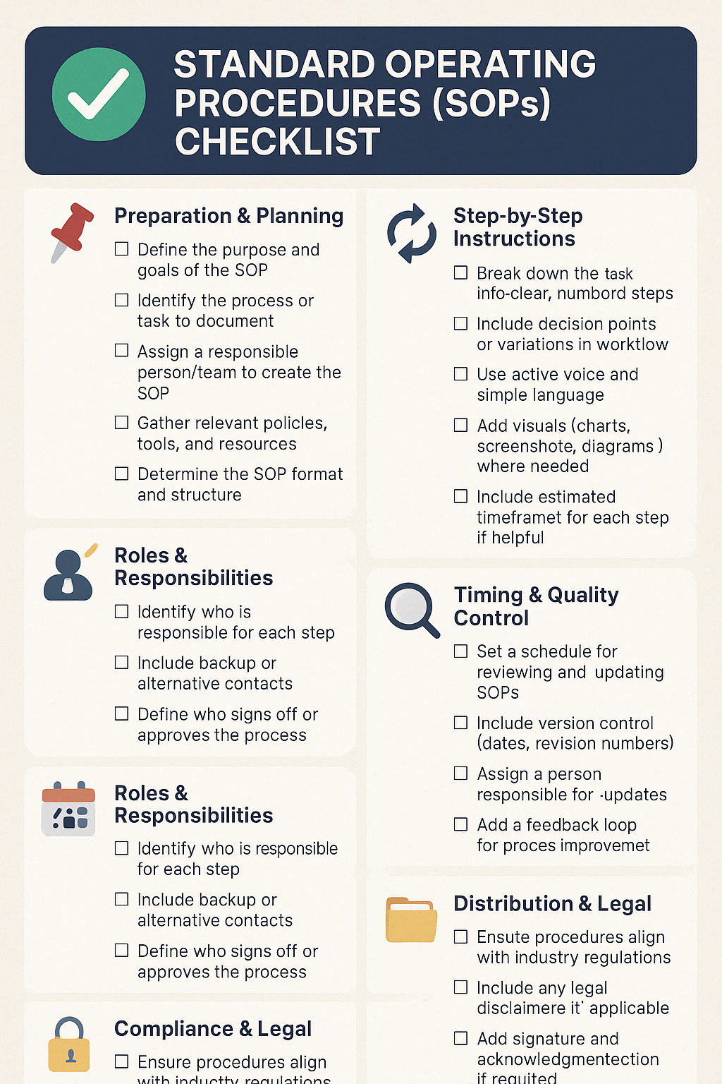 Streamline your business operations with this easy-to-follow SOPs checklist. Designed for entrepreneurs, managers, and teams, this comprehensive tool helps you document every process with clarity and consistency. Whether you're building new procedures or updating existing ones, this checklist ensures no detail is missed—from planning and documentation to roles, tools, timing, and legal compliance. Perfect for creating step-by-step SOPs that drive productivity and quality control across your business.