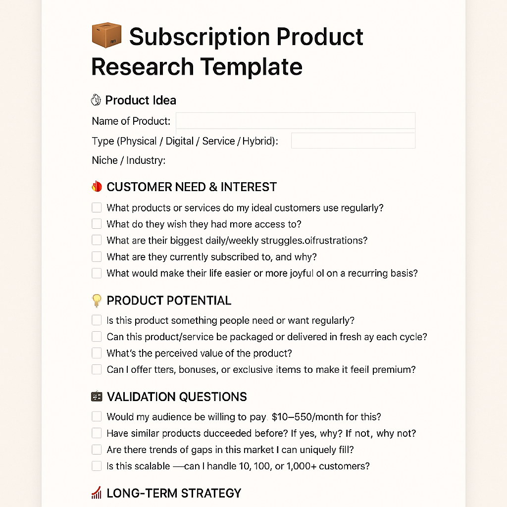 Before launching any subscription or membership business, product research is critical to your success. This all-in-one Notion template helps you uncover the best product ideas by guiding you through customer research, market validation, profitability analysis, and long-term strategy planning.