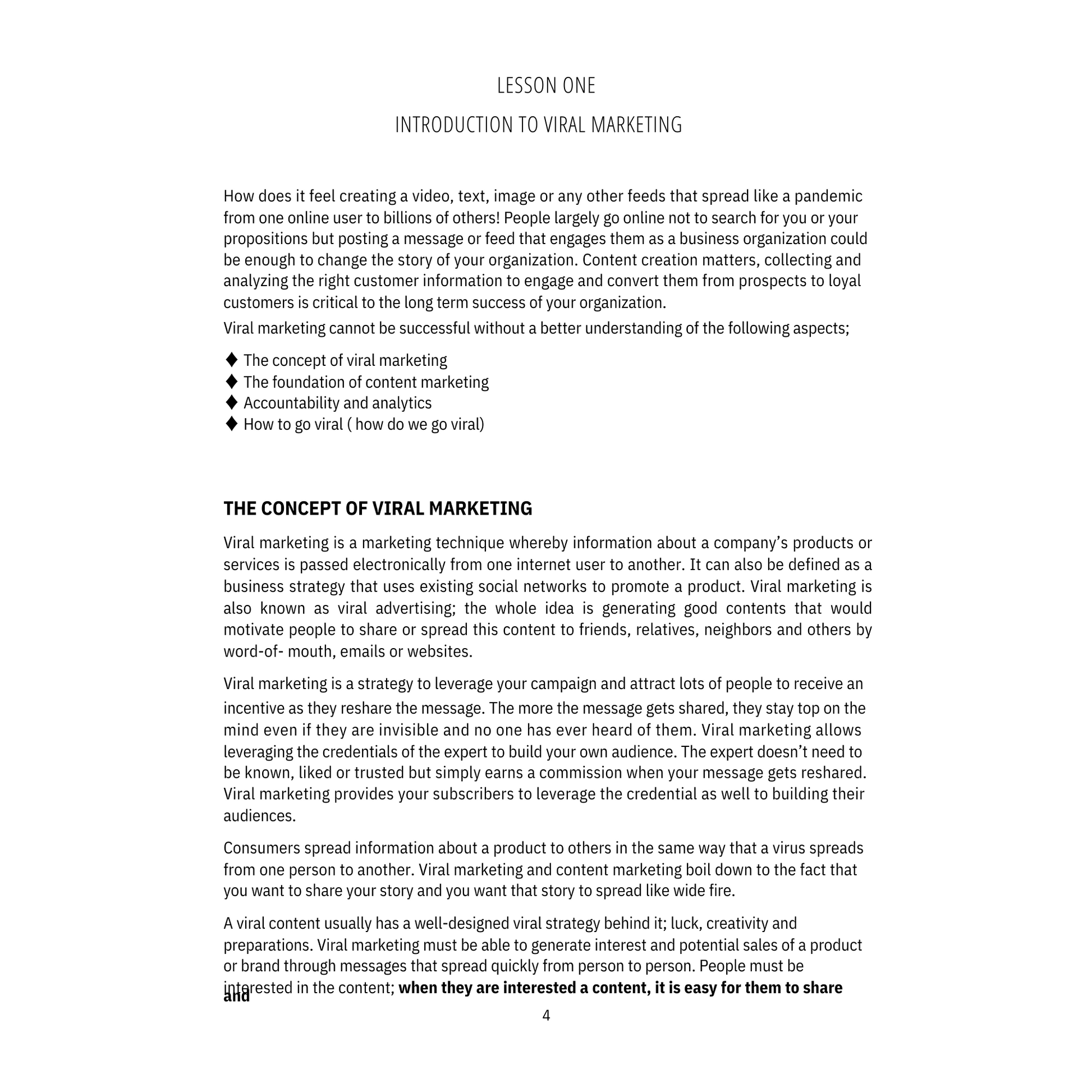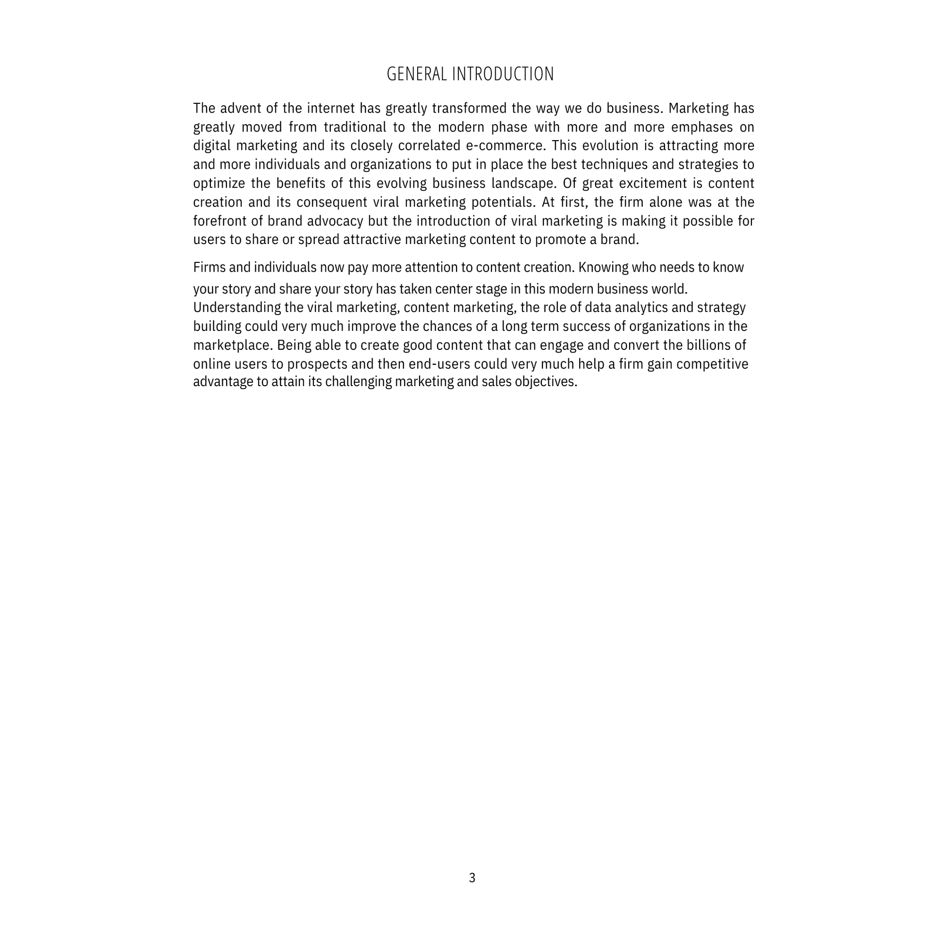 Understanding the viral marketing, content marketing, the role of data analytics and strategy building could very much improve the chances of a long term success of organizations in the marketplace. Being able to create good content that can engage and convert the billions of online users to prospects and then end-users could very much help a firm gain competitive advantage to attain its challenging marketing and sales objectives...