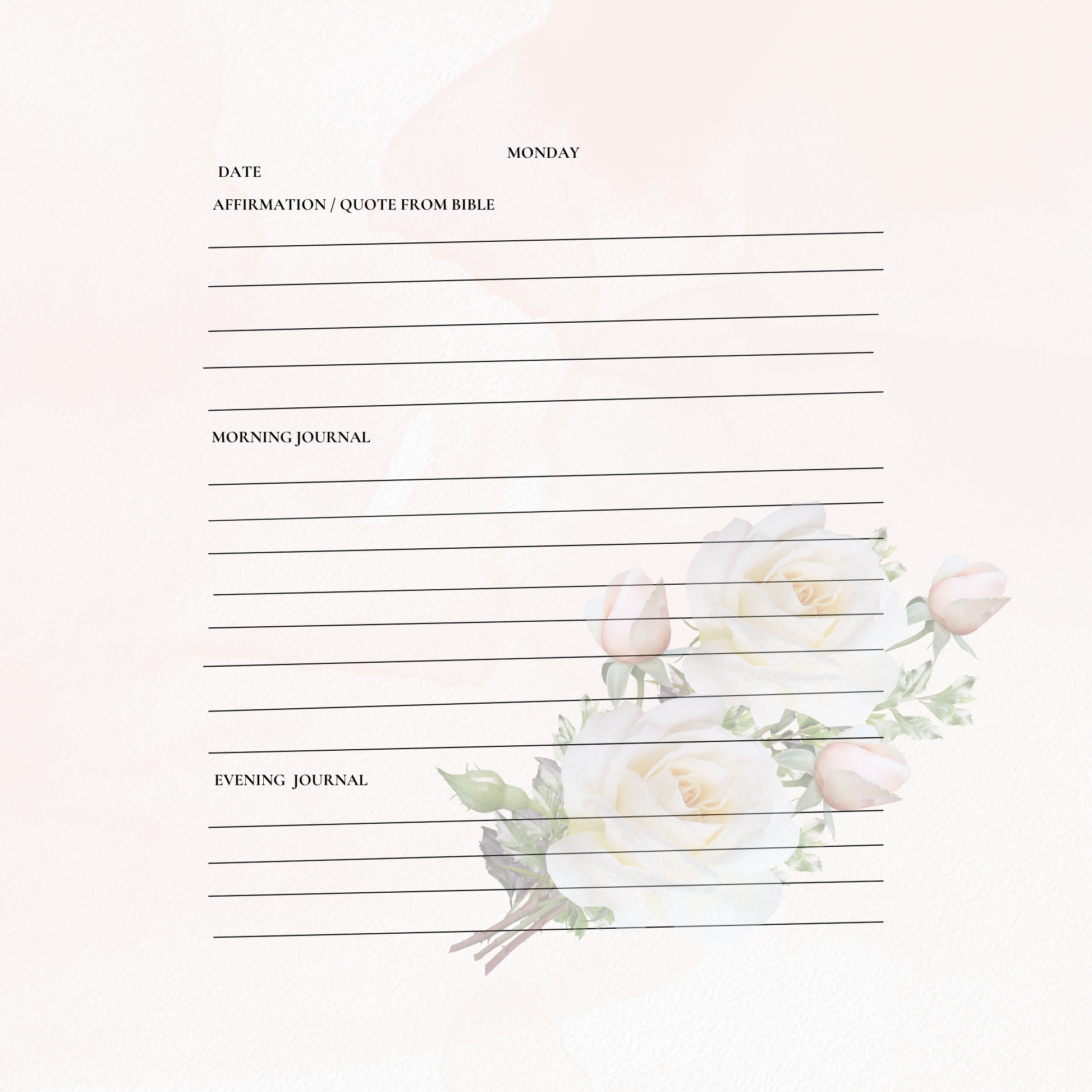 A weekly journal that gives you the opportunity to write your affirmation of the day, a space to write you day's activity and lastly a space for preparation for the next day.