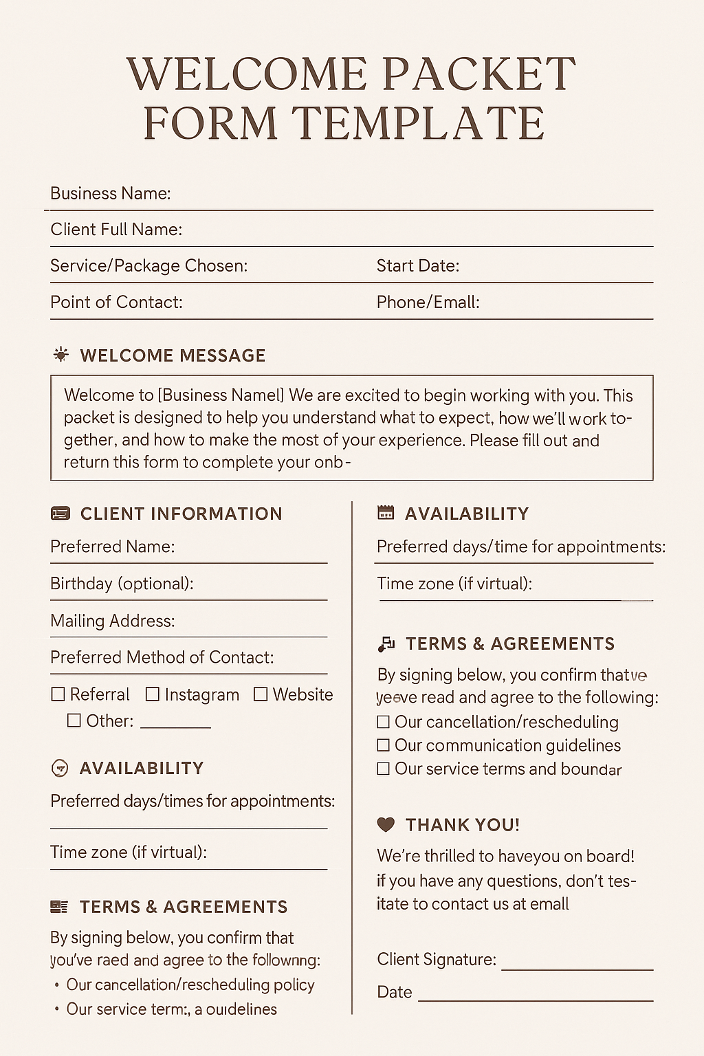 Make your client onboarding process smooth, professional, and welcoming with this Welcome Packet Form Template. Perfect for service providers, creatives, coaches, consultants, and beauty professionals, this editable form gathers essential client information while setting clear expectations from the start.