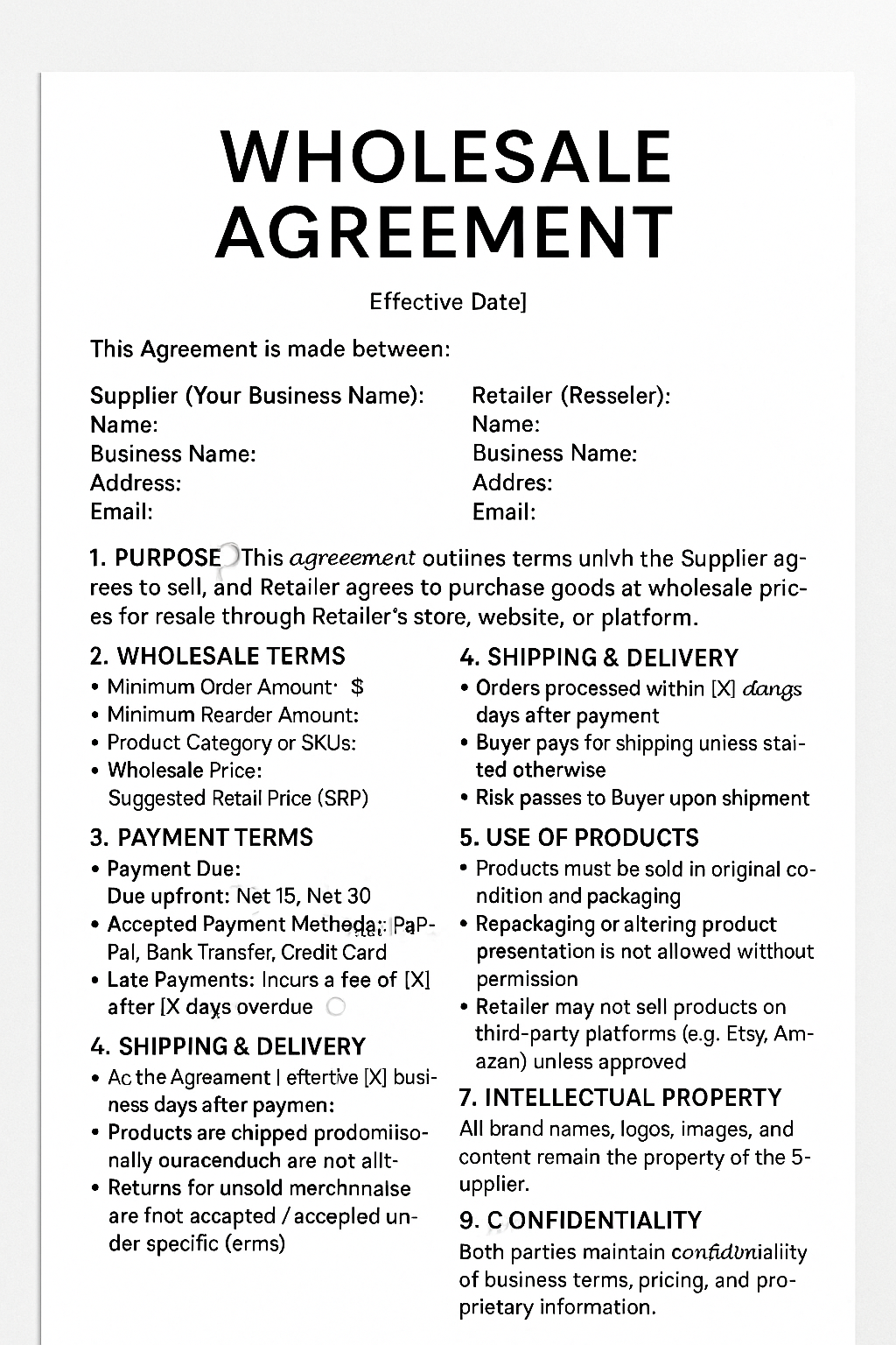 Whether you sell physical or digital products, this template ensures your wholesale relationships are built on clarity and professionalism. Define minimum orders, pricing, payment terms, shipping, resale rights, and more—all in one customizable document.